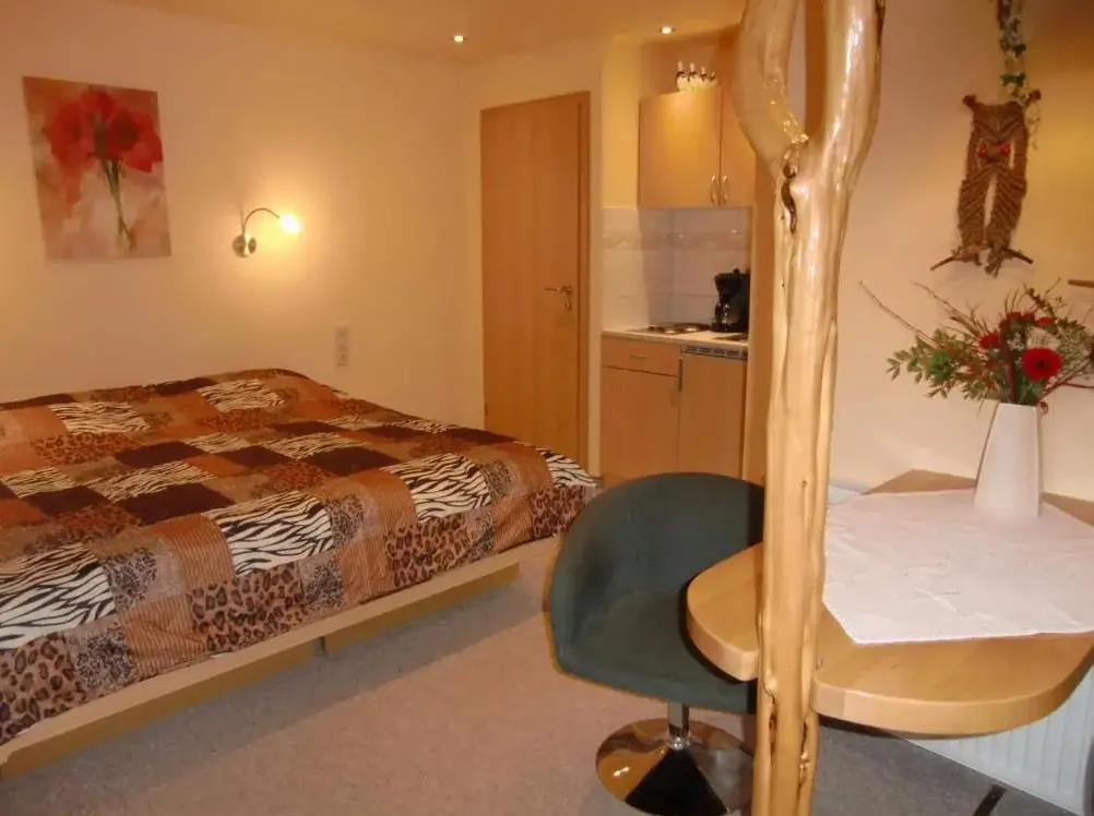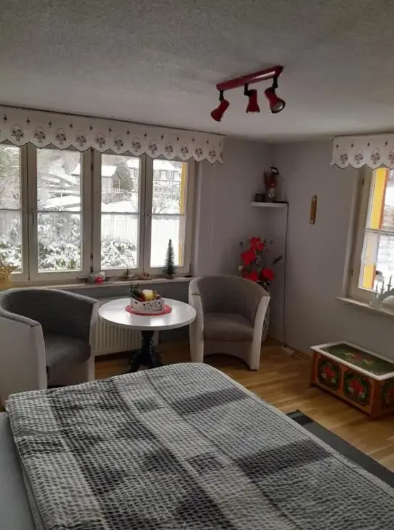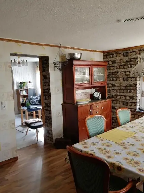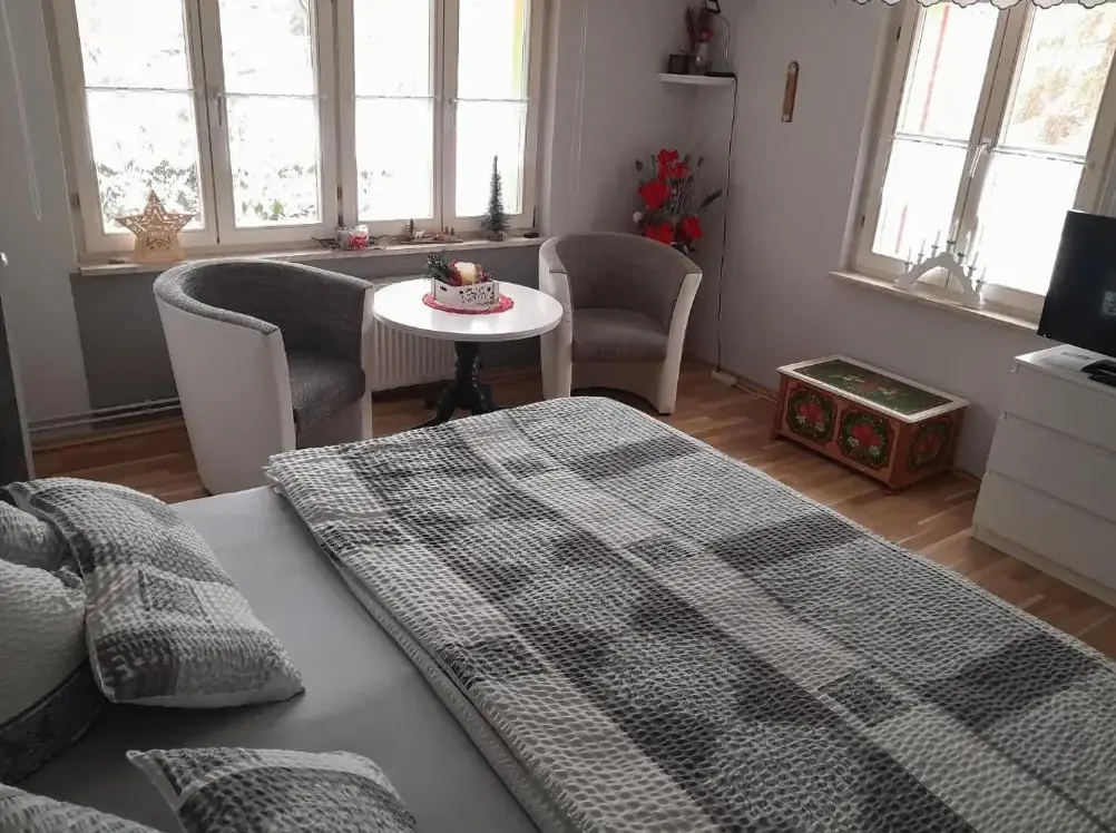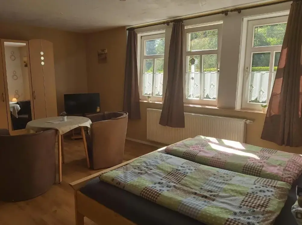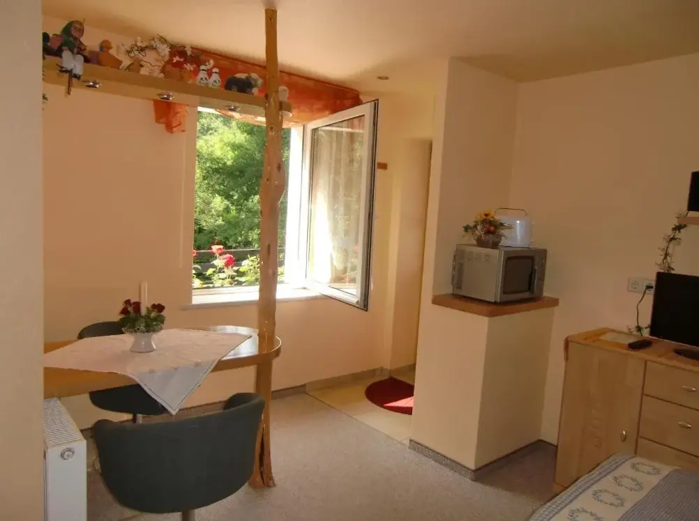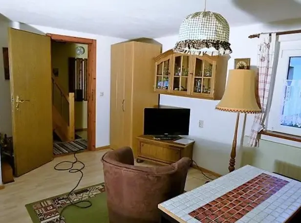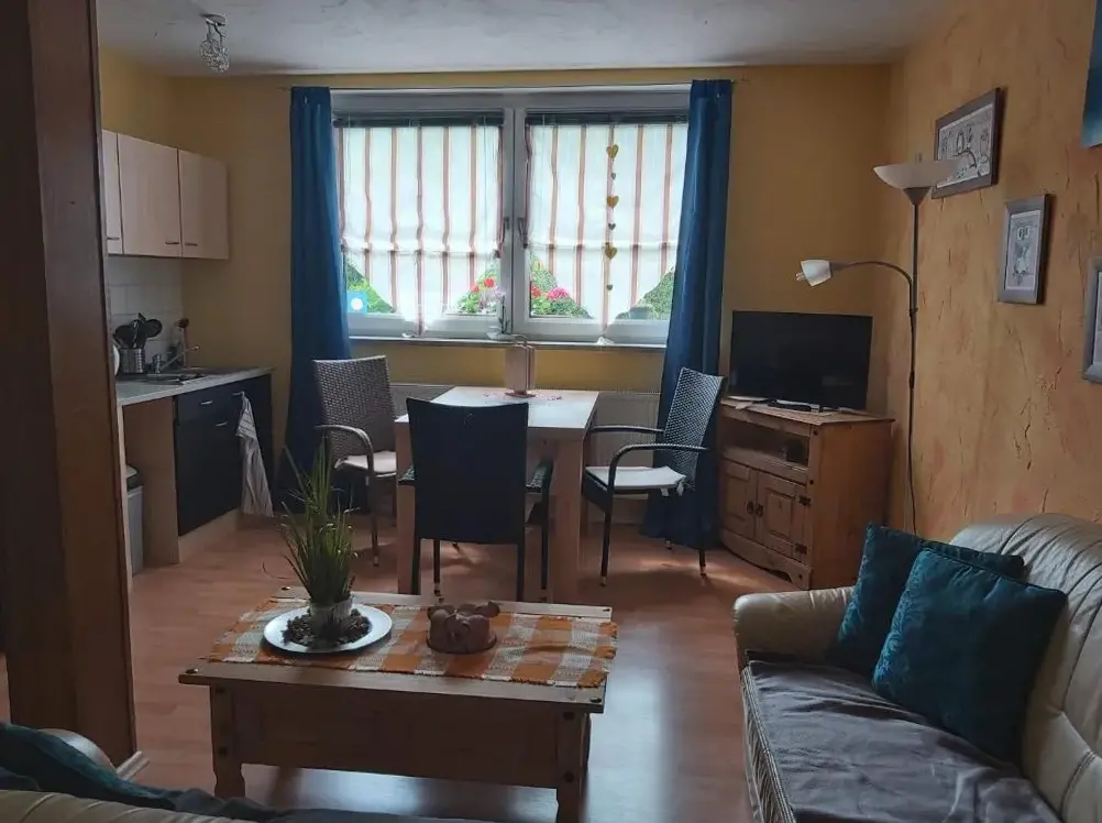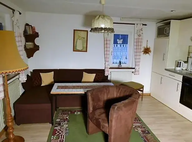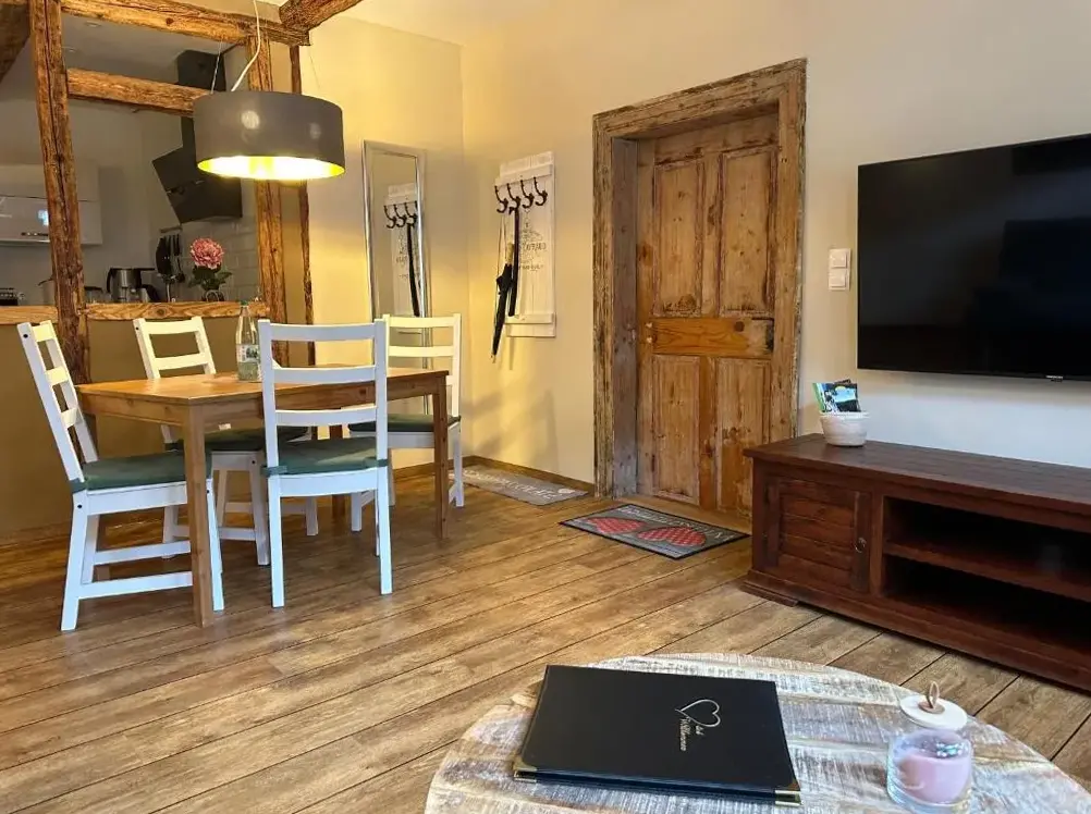More information about Häuslers HerbergeFeWo ,,An der kleinen Wilde'' in Stolberg offers a spacious apartment featuring one bedroom and a living room. The property includes a fully equipped kitchen, a cozy fireplace, and a dining area. Modern amenities such as free WiFi, a kitchenette, and a coffee machine are available, along with a washing machine, TV, and free toiletries. An outdoor seating area allows guests to relax.