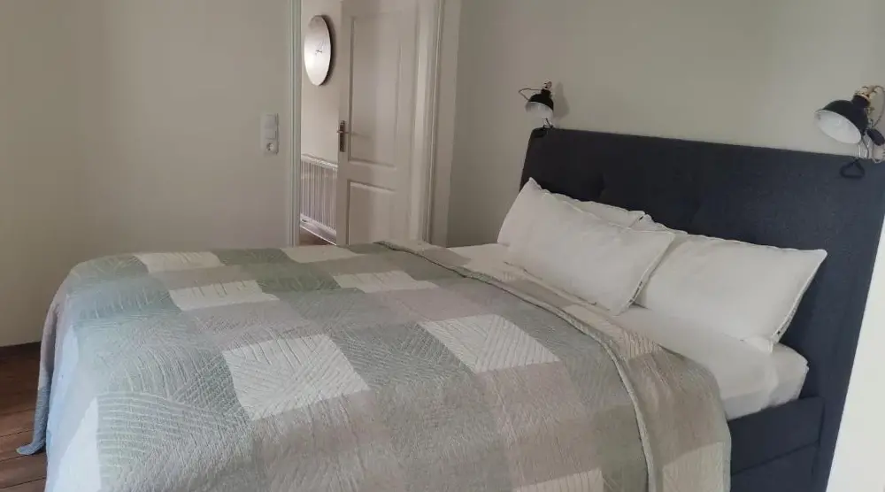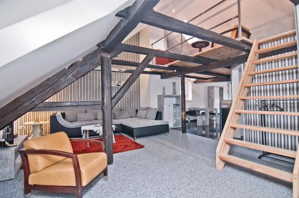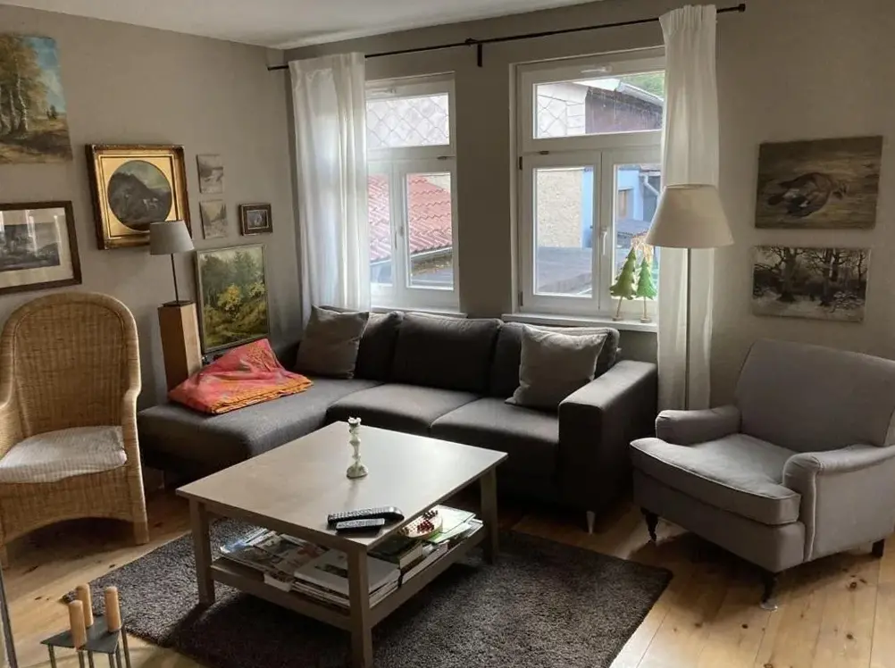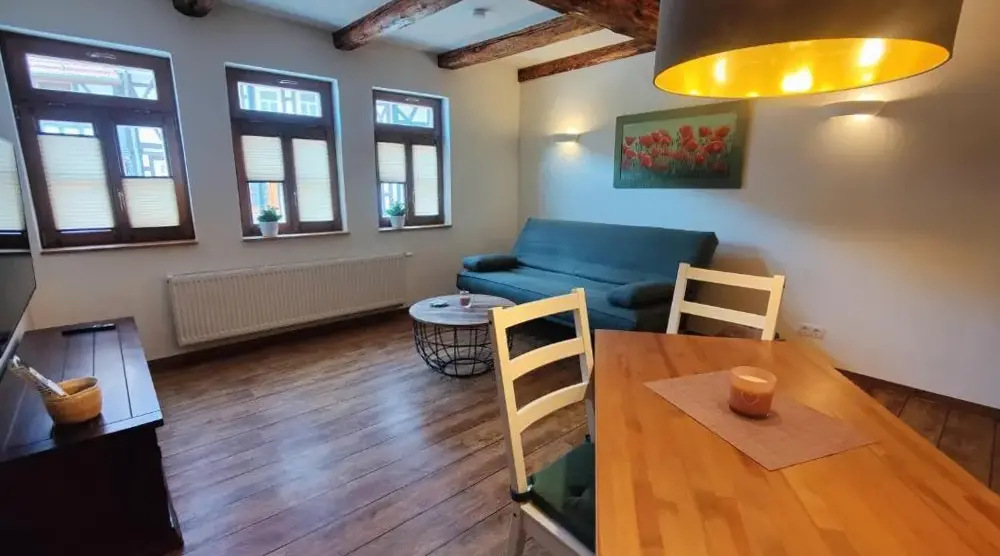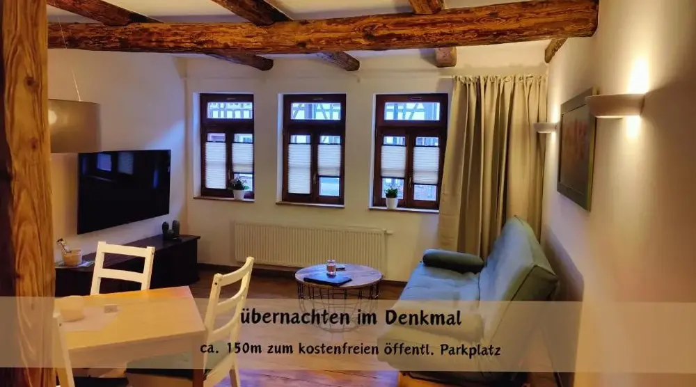Häuslers Herberge in Stolberg (Harz) provides a distinctive living experience within a historic structure. This apartment boasts a sun terrace and outdoor seating area offering scenic garden and mountain vistas. The modern interior includes complimentary WiFi, a well-equipped kitchen with dishwasher and washing machine, ensuring comfort during stays.